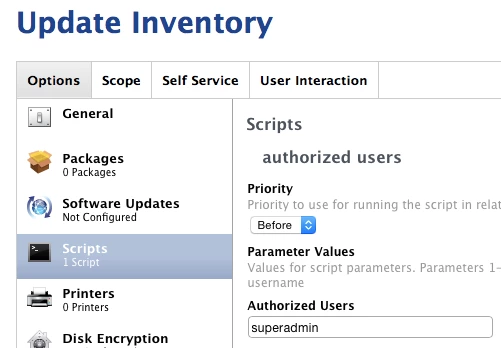 You could populate the parameter 4 field of the script settings in the JSS with superadmin to exempt this authorized user account.
