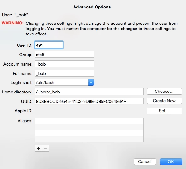 - authorized user accounts created by an application or by Server.app with UID under 500